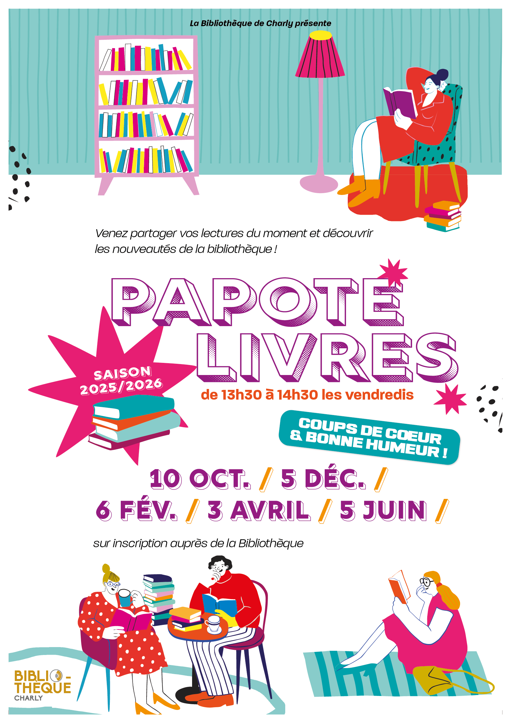 Gratuit, sur inscription auprès de la Bibliothèque. Prochain rendez-vous vendredi 10 octobre de 13h30 à 14h30. Lieu : Bibliothèque municipale de Charly.